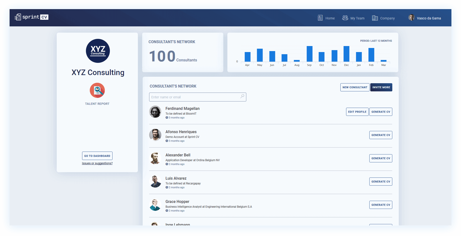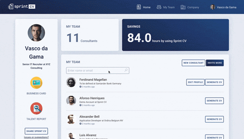 Single dashboard where the IT recruiter can access to all of their consultant’s CV, edit their business card, invite more consultants and see some key indicators of their profile.